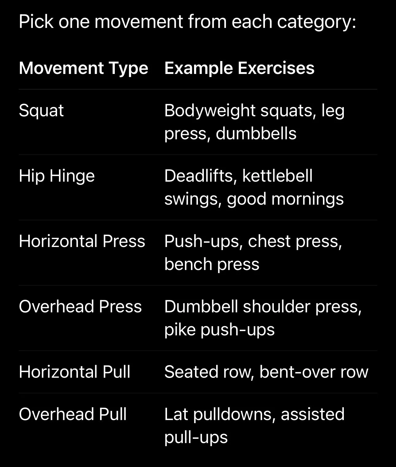 Prioritising full-body movements like squats, deadlifts, presses, and pulls