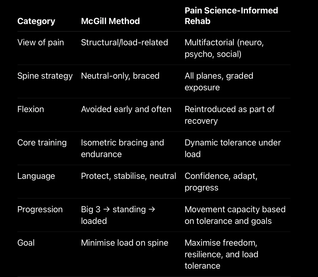 Comparison Table: McGill Method vs. Modern Pain Science Rehab