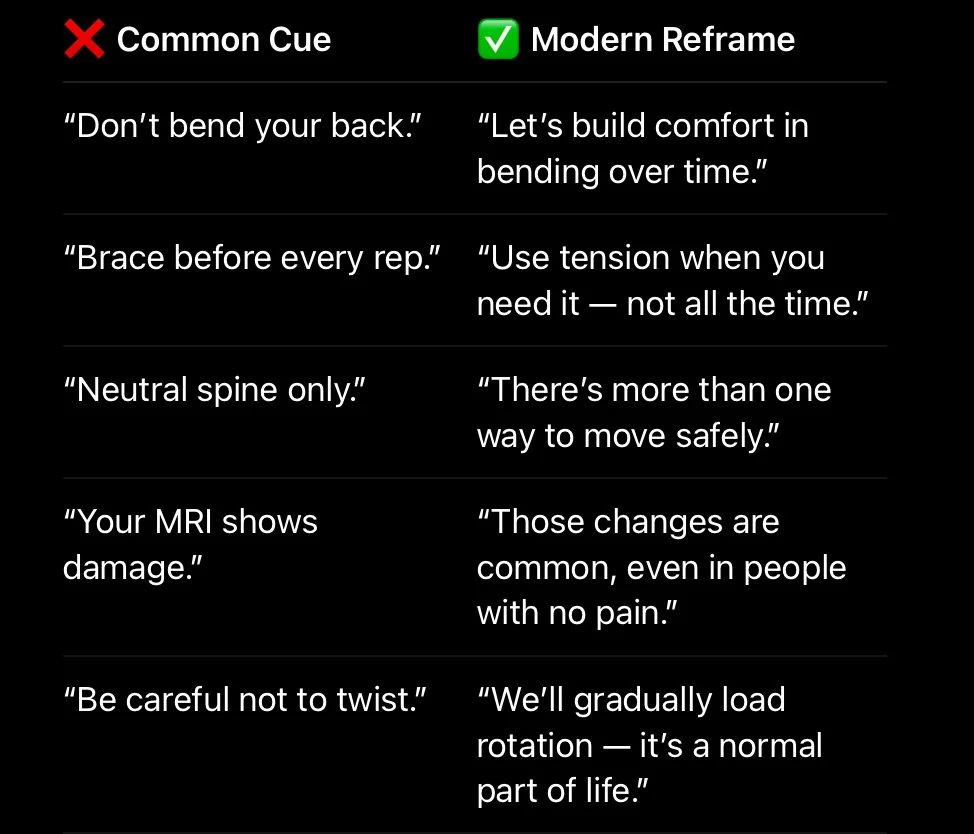 Language is one of the most powerful tools in spinal rehab — for better or worse. Here are practical clinical reframes to use immediately: